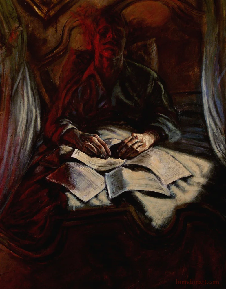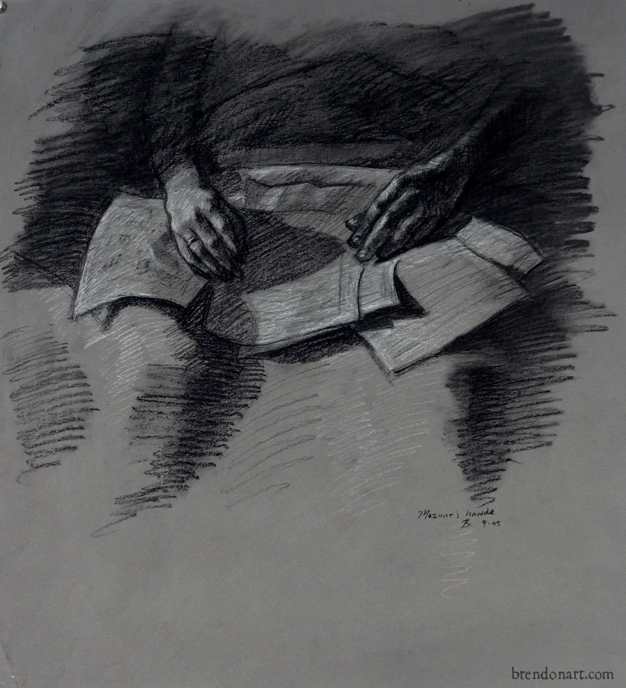 Below: a study for Mozart's hands amongst unfinished sheets of music composition.